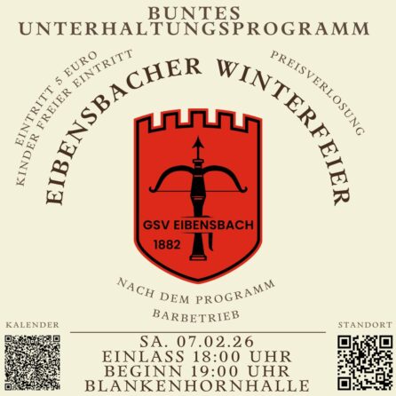 3. Februar 2026WeiterlesenAm Samstag, den 07. Februar, lädt der GSV Eibensbach wieder zu seiner beliebten Winterfeier in der Eibensbacher Blankenhornhalle ein. Also – bitte diesen Termin im Veranstaltungskalender rot anstreichen, denn ein attraktives, stimmungsvolles Programm mit Beginn um 19:00 Uhr erwartet die Besucher! Die Saalöffnung ist um 18.00 Uhr. Die Essensausgabe...
