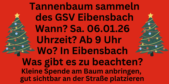 Wir sammeln wieder eure Tannenbäume in Eibensbach und entsorgen diese fachmännisch gegen eine kleine Spende an den Verein! Wann? Sa. 06.01.26 Uhrzeit? Ab 9 Uhr Wo? In Eibensbach Was gibt es zu beachten? Kleine Spende am Baum anbringen, gut sichtbar an der Straße platzieren
